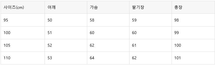 - 사이즈는 재는 방법에따라 약간씩 다를 수 있으며, 기성복으로 대량생산하기 때문에 사이즈는 약간씩 오차가 있을 수 있습니다