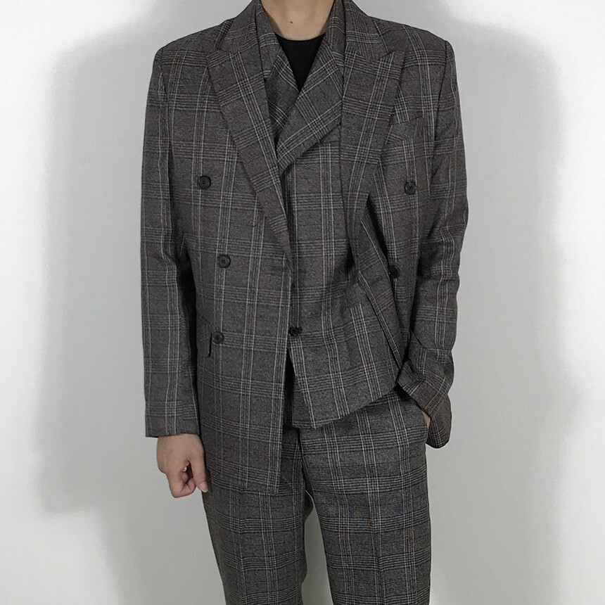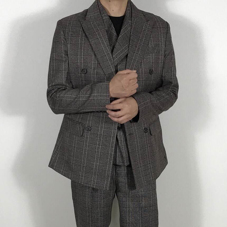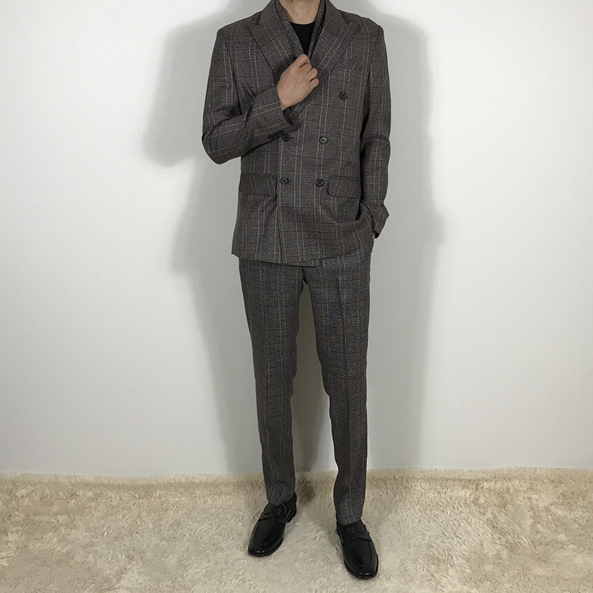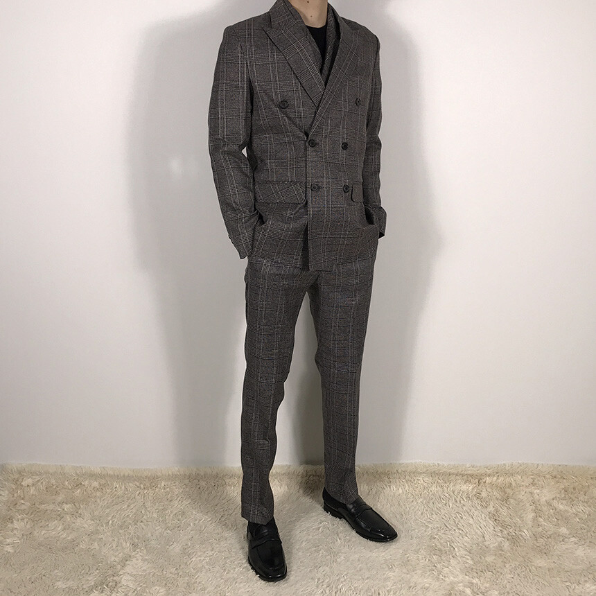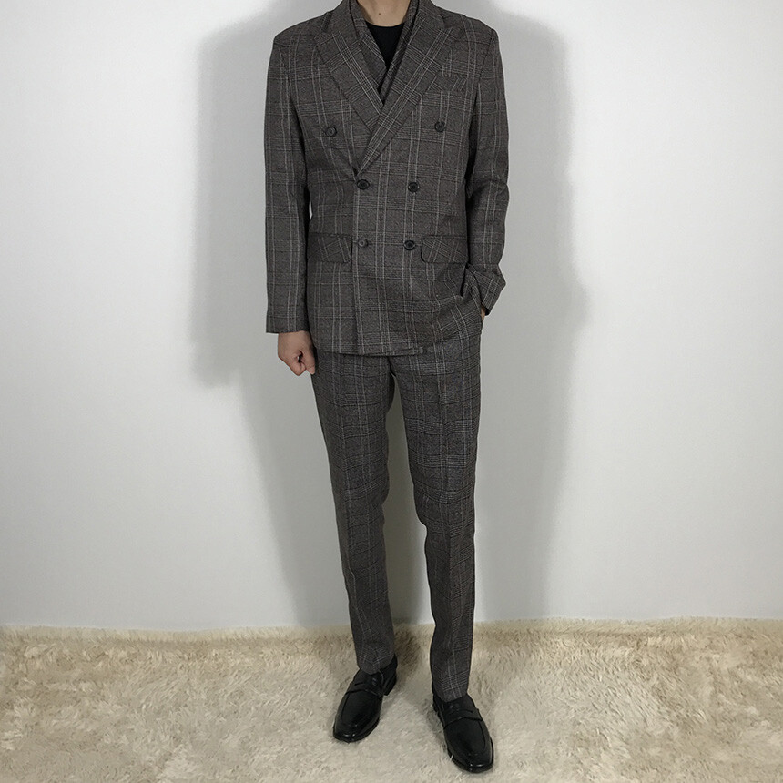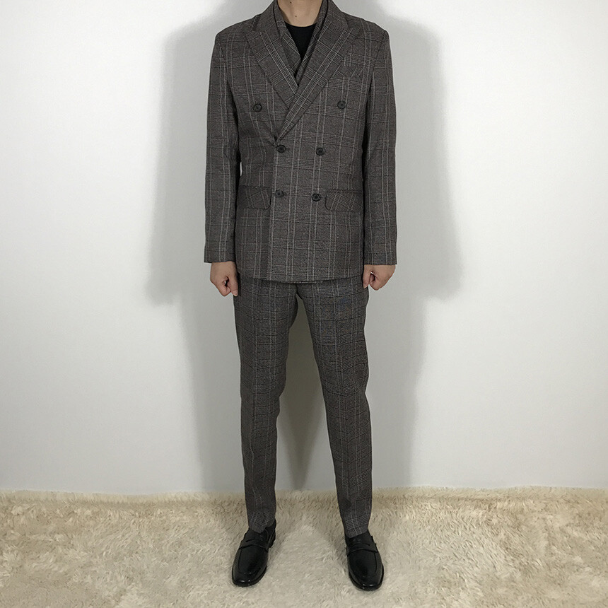 슬림핏 글랜체크 회브라운 쓰리피스 더블수트