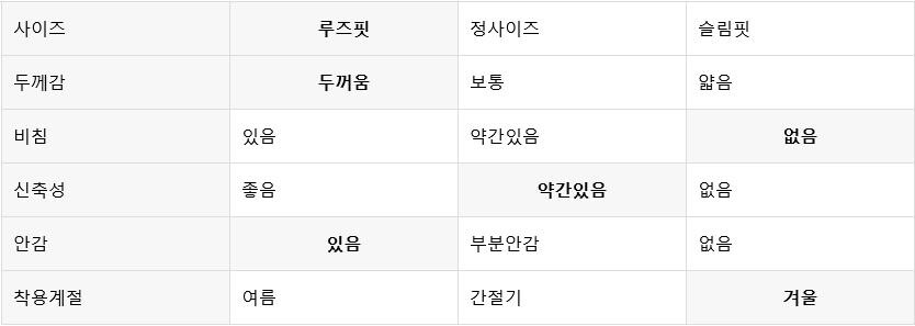 평소 입던 스타일과 달라 만족도가 낮을 수 있습니다