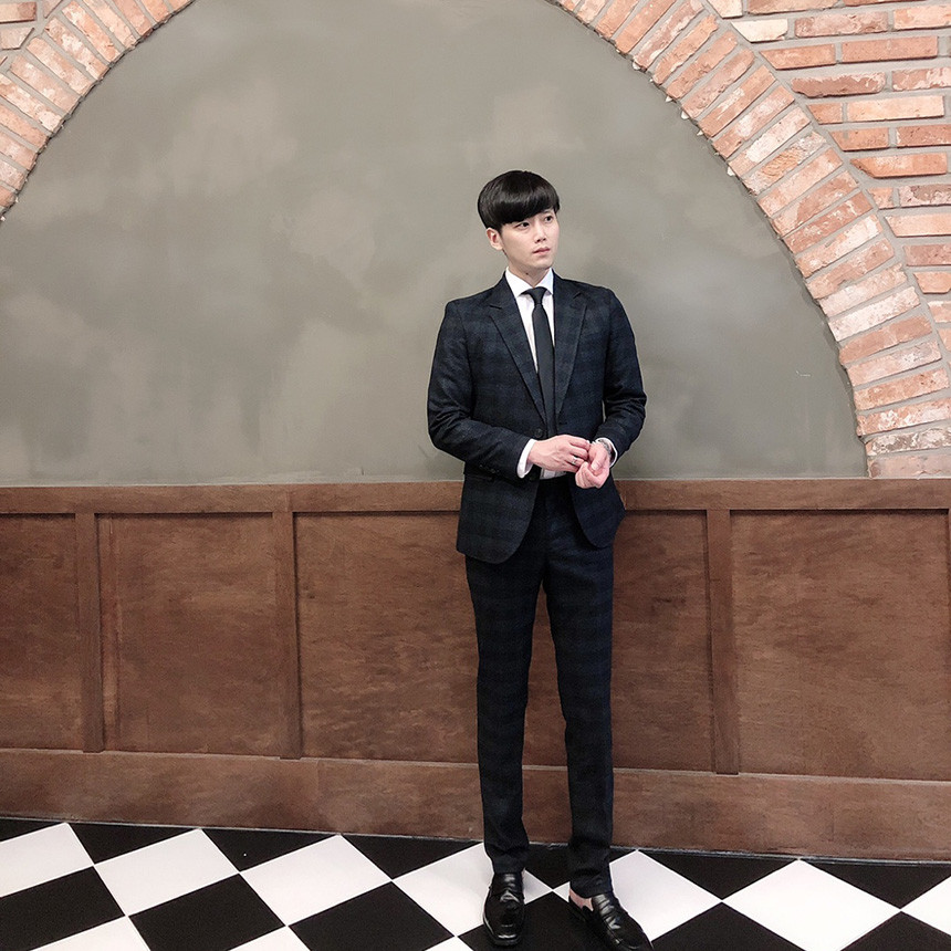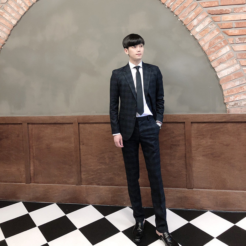 체크무늬의 블랙 수트 입니다.