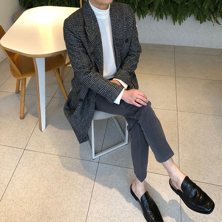 더블 디자인의 무릎 밑까지 오는 롱한 기장입니다.