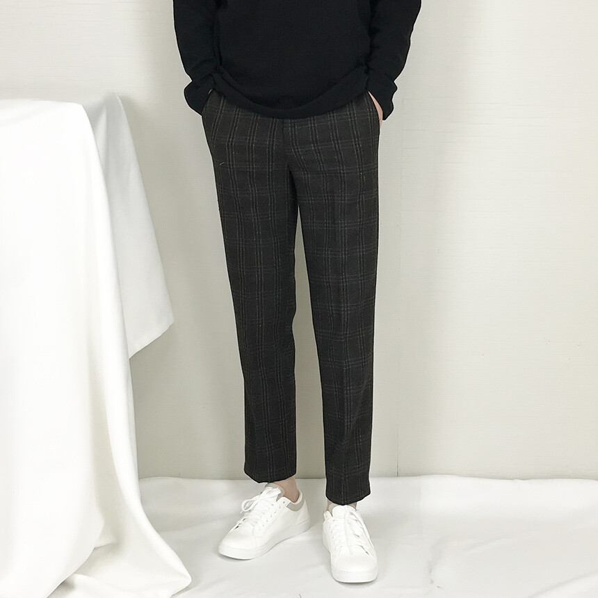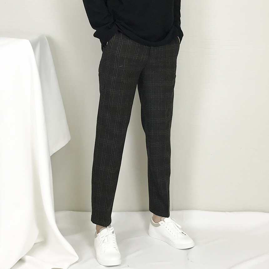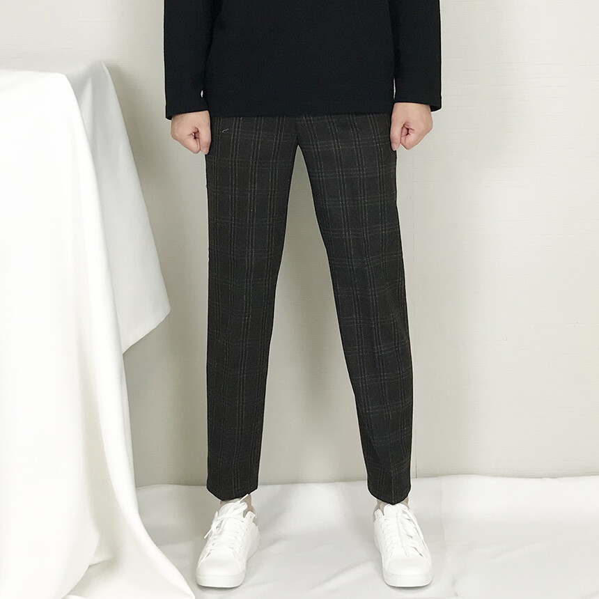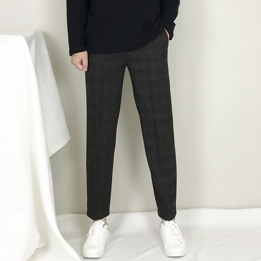 카키블랙 체크 모직 캐주얼 슬랙스
