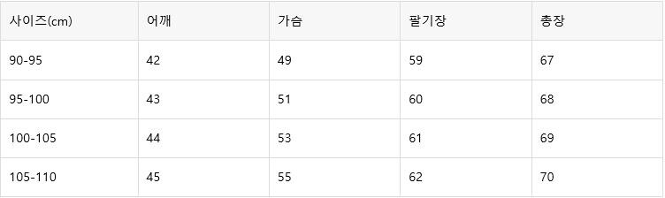 예시)본인사이즈100이면 100-105사이즈 구매 권장