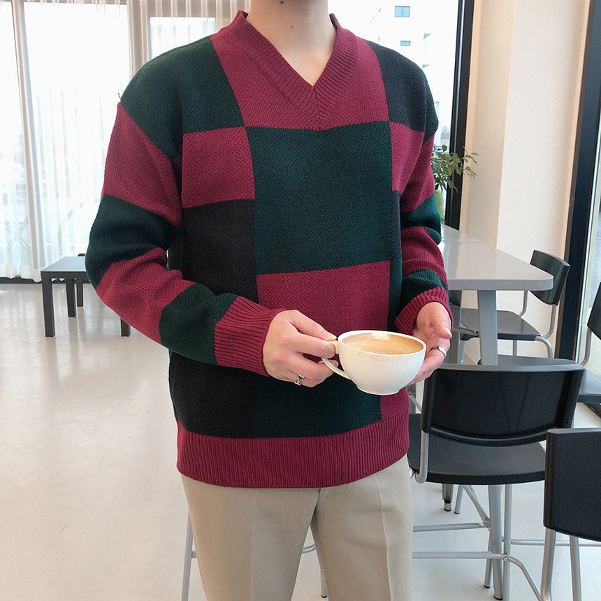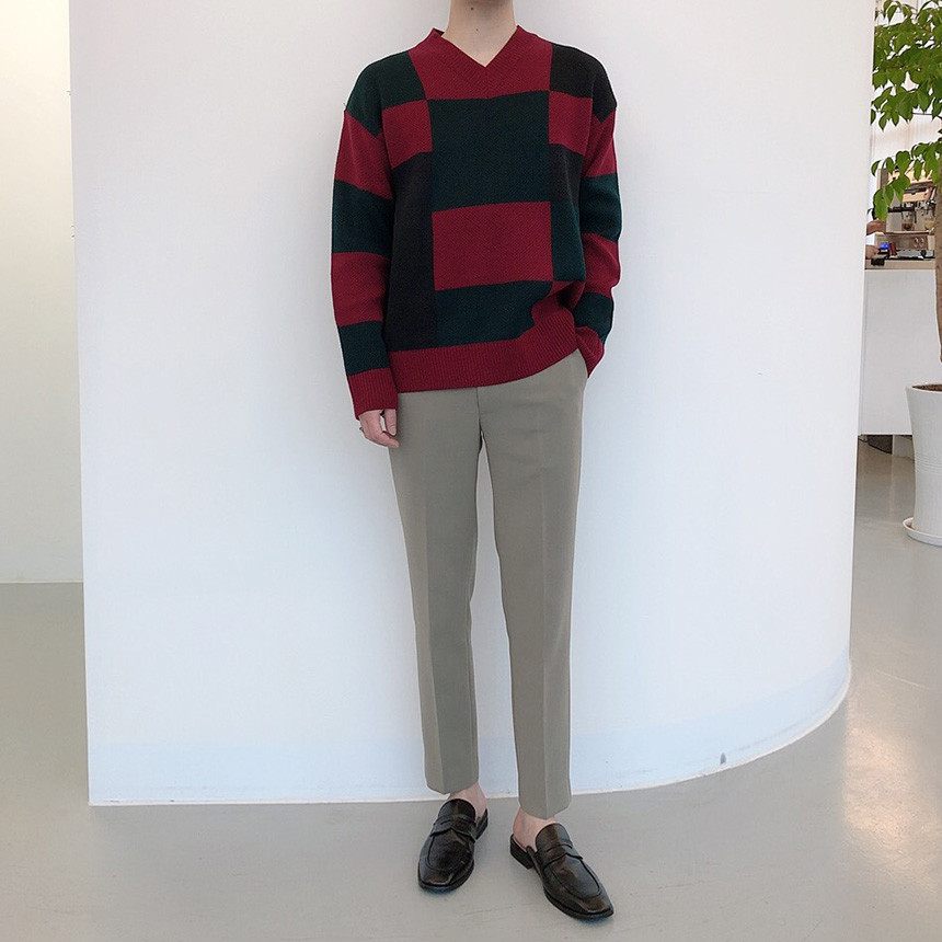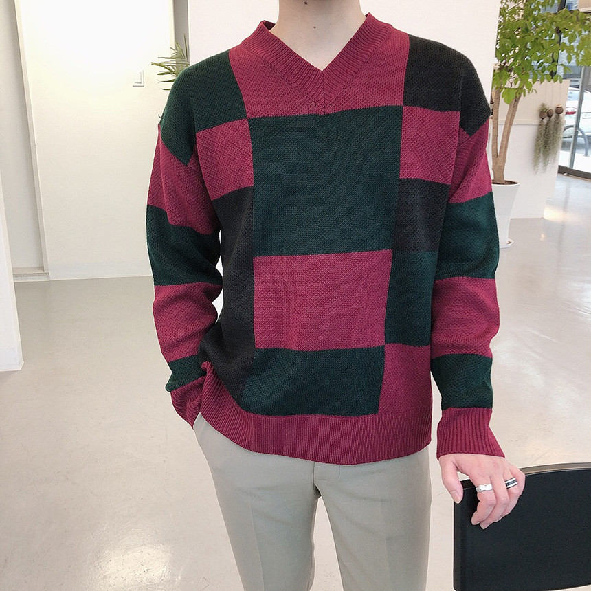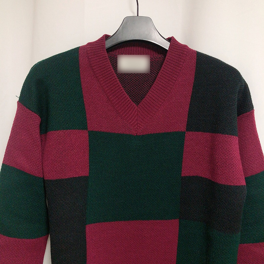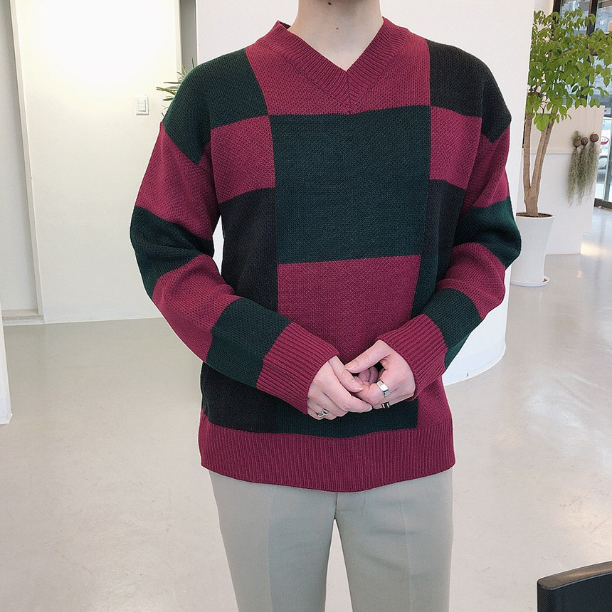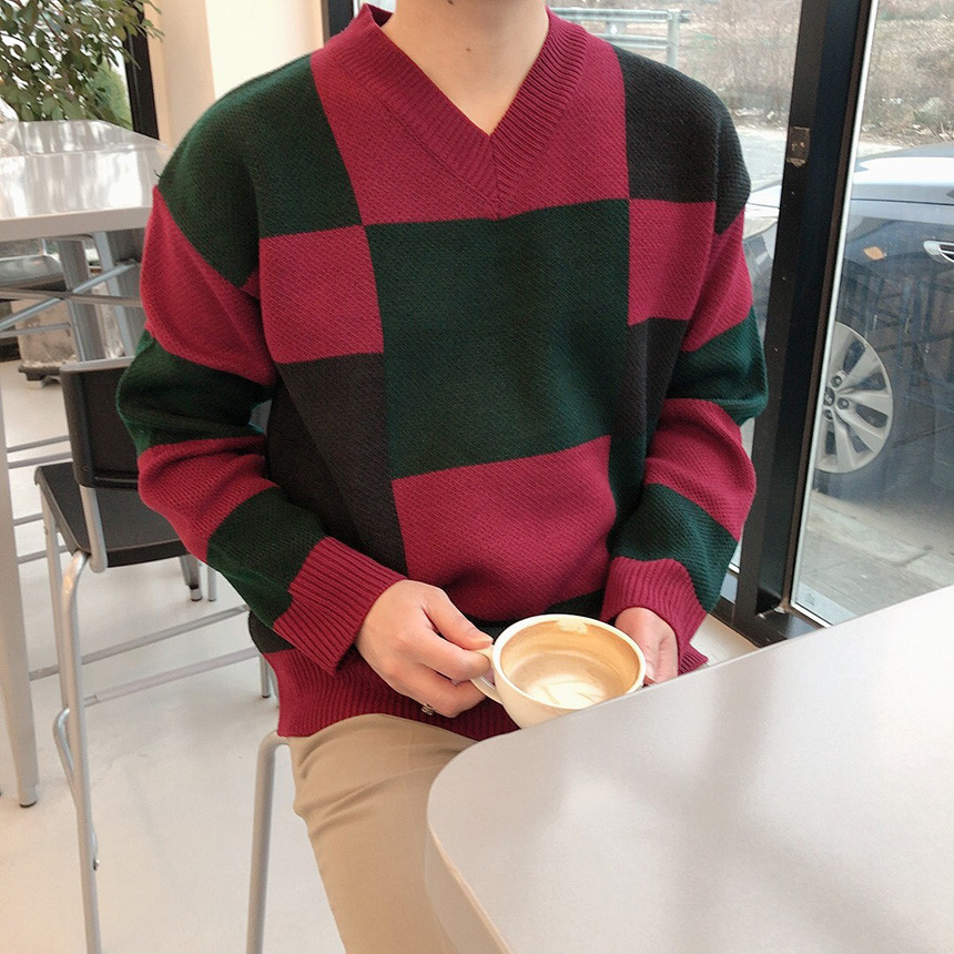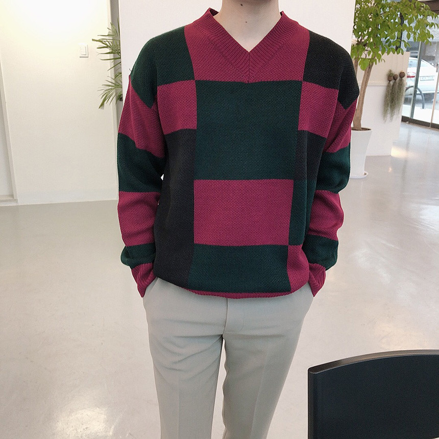 체크 도형 V넥 니트