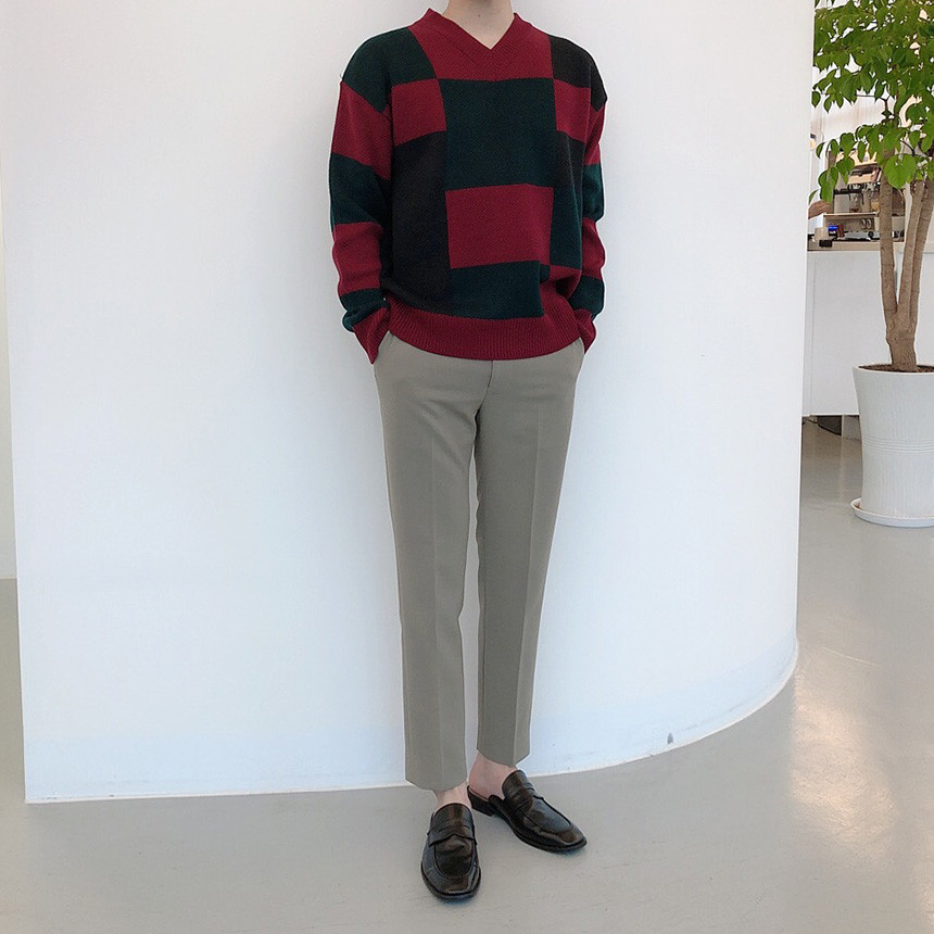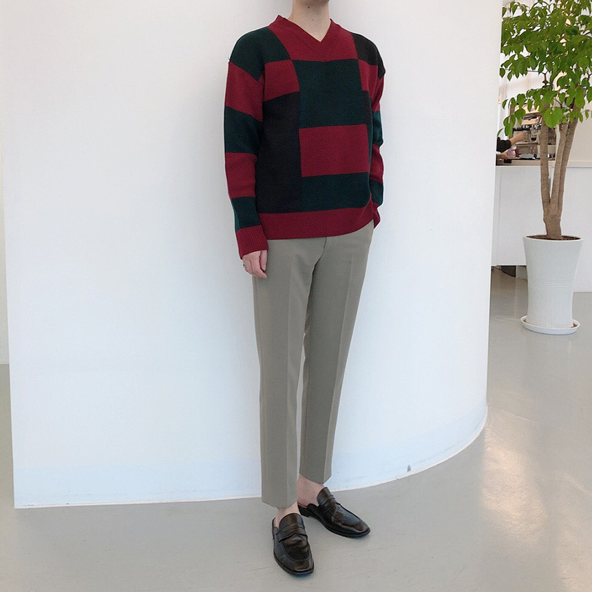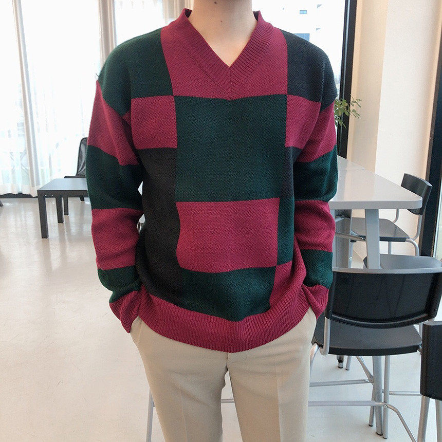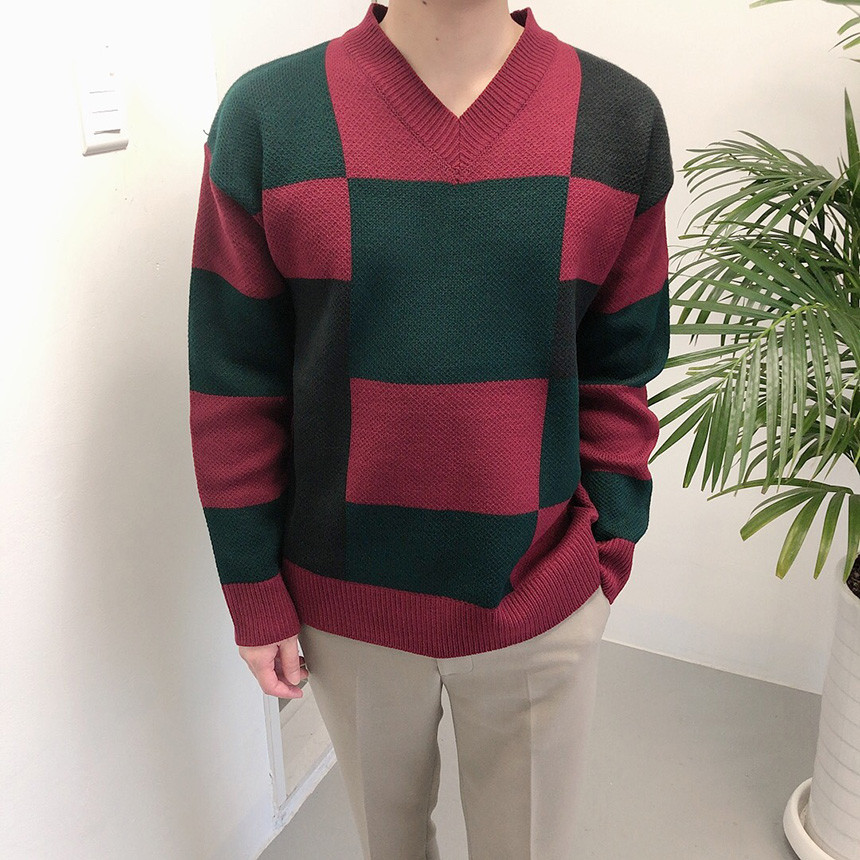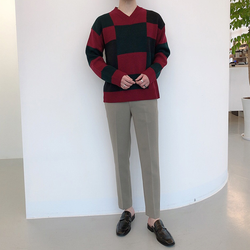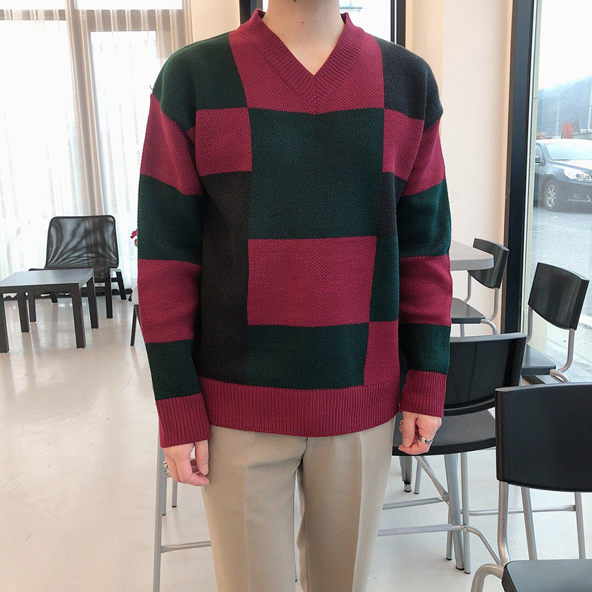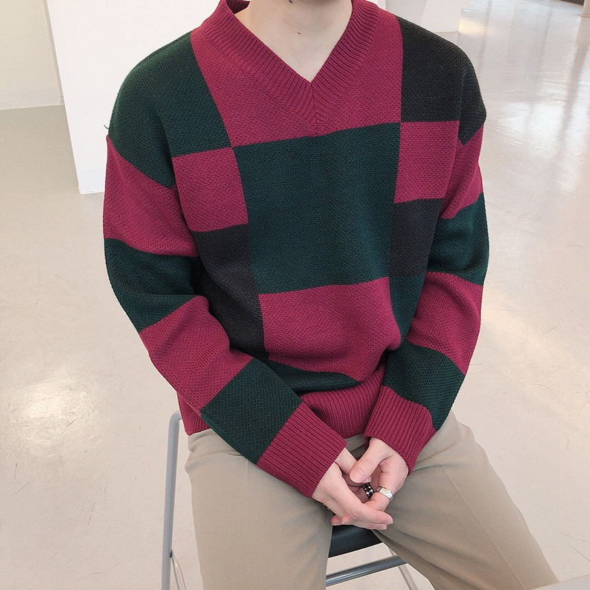 체크 도형 V넥 니트