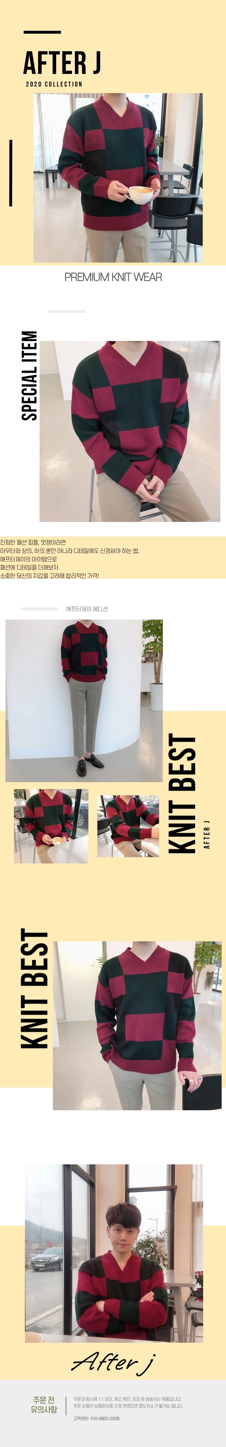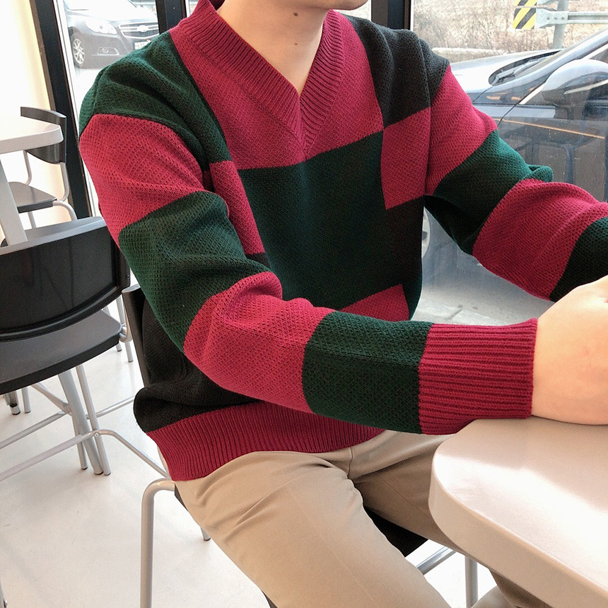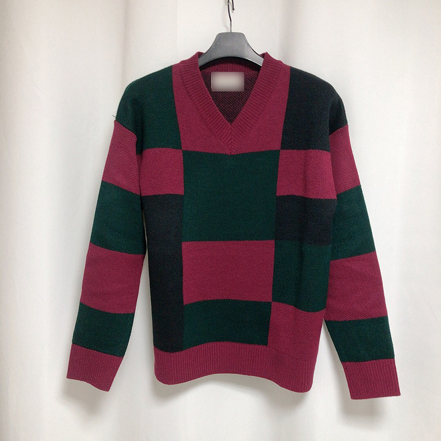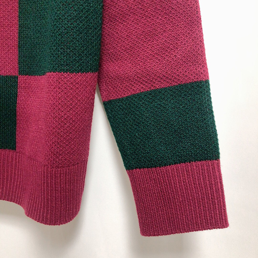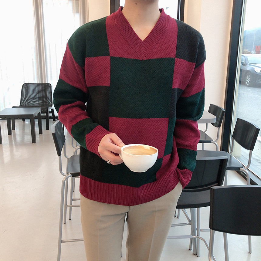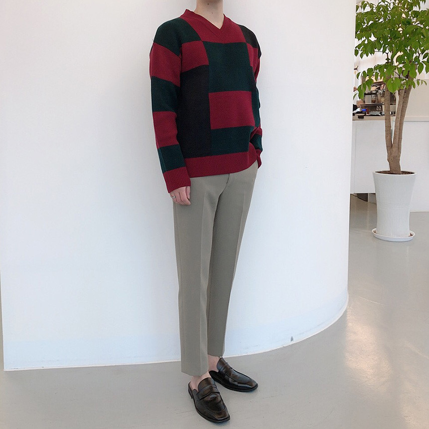 체크 도형 V넥 니트