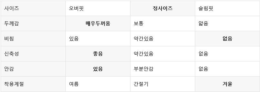 예시)본인사이즈100이면 100-105사이즈 구매 권장